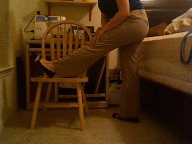 3. estiramiento de bailarina(estiramiento de isquiotibiales de pie): soporte y llevar una pierna recta frente a usted sobre una superficie estable como una silla de ruedas no o escritorio. Mantener la espalda recta, bisagra hacia adelante en su cintura hasta que sienta un estiramiento detrás de su pierna superior. Si el tramo es demasiado intenso, pruébalo sin llevar la pierna hacia arriba en cualquier cosa, sólo directamente delante de usted. Traer la pierna superior dificulta el estiramiento