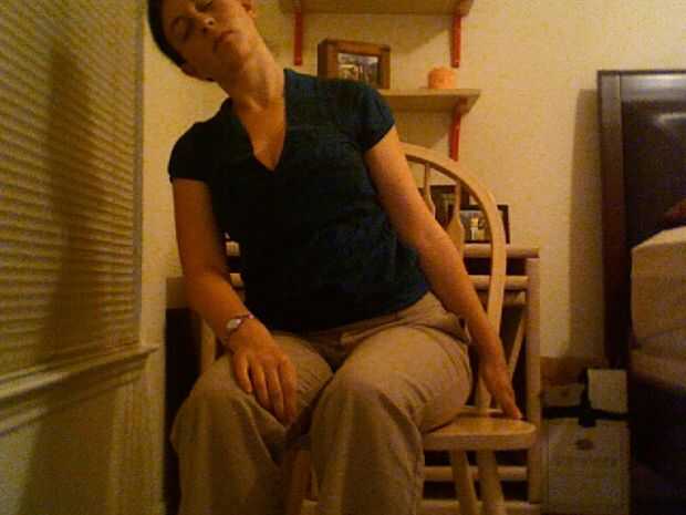 1. agarre y se inclina(tramo superior de la trampa que se sienta): sentado en su silla en buena postura, sostener la parte inferior del asiento e incline su cuerpo lejos. Debe sentir el estiramiento en el lado del brazo que sujeta el cuello.