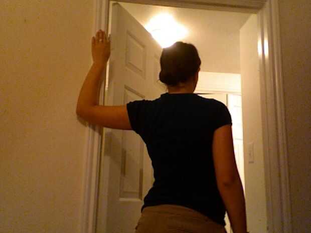 4. voto y giros(estiramiento de pectorales de pie): parado en una puerta, paralela a la pared. Elevar un brazo hasta la altura de los hombros como que le está dando un voto, la mano debe ser plano contra la pared. Ángulo de su bodt lejos de su brazo hasta sentir un estiramiento en el pecho o la espalda.