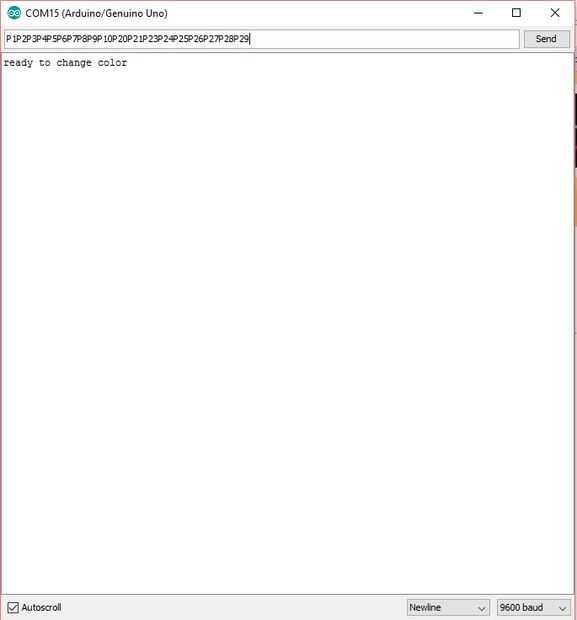 puedes enviar tantos comandos a la vez como esto: 'R100G100B255P0P1P2P3P4P5P6P7P8P9P10' - Esto establecerá píxeles 0-10 en azul brillante