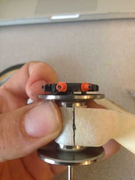 OK, toma la cinta adhesiva y enrolle lentamente alrededor del carrete. Justo antes de llegar completamente alrededor de usar el utensilio de escritura para marcar el diámetro de la bobina. Pelar su carrete y utilizarlo para medir un trozo limpio de cinta adhesiva con los bordes limpios que sólo han cortar con la maquinilla de afeitar o tijeras. Coloque firmemente la cinta adhesiva al centro del carrete.