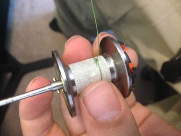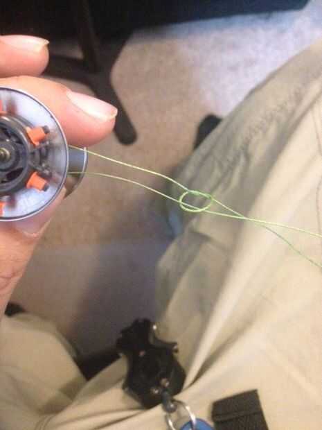 7. Pon tu dedo sobre nudos y tire girando el carrete hasta el lazo apretado alrededor del carrete