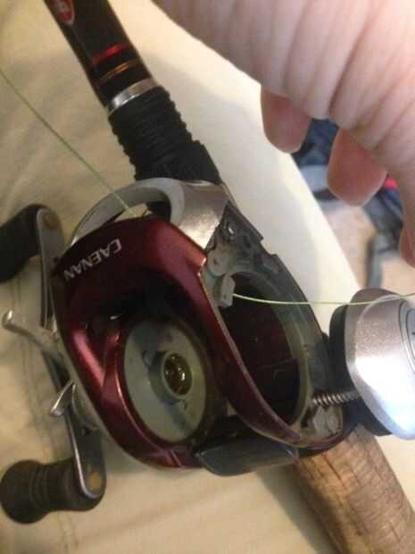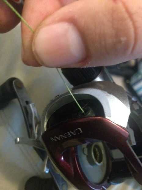 Para Baitcasting, ejecute la línea a través del ojo del carrete y el panel lateral de apertura.