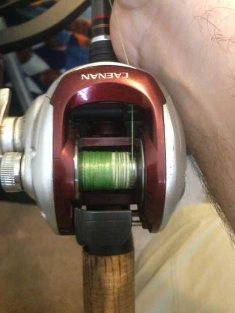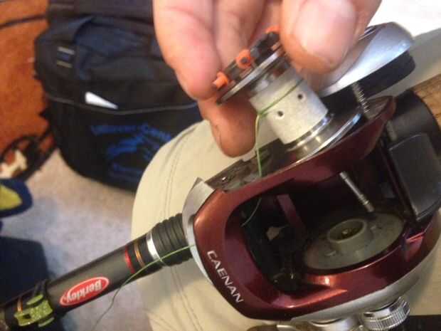 Para baitcasting, asegúrese de que no Envuelva la cuerda alrededor del eje de la bobina al colocar el carrete en la carcasa del carrete,