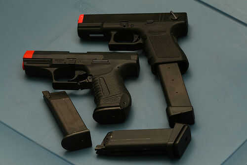 iv ya hablamos de la armadura de cuerpo y donde conseguirlo, pero ahora es el momento para las armas. el cuadro en la parte inferior es un ejemplo perfecto de dos tipos de brazos laterales. el walther(bottom left) es un arma preciso con una tasa de medio disparo. algunos modelos (como el mío) también vienen con un compartimento extra bb en la parte posterior del clip. la glock (arriba a la derecha) es una pistola con una tasa de disparo automático que tiene mala precisión. no creo que hay cualquier modelo de auto completo con un clip dos compartimentos, pero ya tiene una capacidad decente de bb de 30-50 (dependiendo del modelo). ésos son sólo dos ejemplos de brazos laterales, hay muchos modelos más pero esos son más o menos las categorías principales.