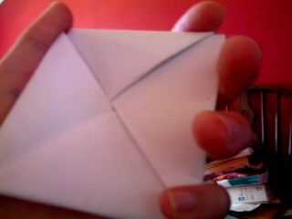 Ahora doblar uno de los triángulos en el centro. Ir del reloj hasta que en el izquierdo dos. un triángulo ascendente y maneras de un lado. Meta el triángulo va hacia arriba en el segundo triángulo. (El otro es el que está en la parte superior)