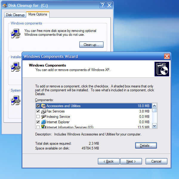 Ahora ir a la Inicio > todos los programas > accesorios > herramientas del sistema > disco > más opciones > (bajo Windows componentes) limpiar. Quité los punteros del Mouse, juegos en Internet, MSN Explorer, Windows Messenger, Outlook Express, (y si está ejecutando Windows XP MCE) bailarín de Windows.