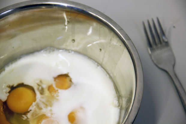 Batir los huevos y la leche y sazone con sal/pimienta/paprika y batir otra vez. Recuerde que está bien ser pesado entregado con la pimienta y la paprika pero no muy bien con la sal. Vierta la mezcla de huevo batido encima de las ortigas en la base de la tarta, tratando de distribuirlo uniformemente. La mezcla de huevo debe subir a la cima de las ortigas dependiendo de las dimensiones de los recipientes de cocción. Si el huevo no viene en la parte superior luego presione las ortigas.