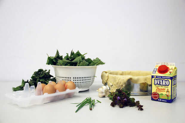 Rellenar la tarta perfecta primero con ortigas y ajo, cebollino y hiedra terrestre en la parte superior.