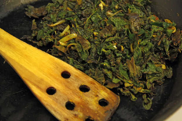 Caliente una sartén a fuego medio alto. Cuando esté caliente agregar el aceite seguido de ortiga, ajo y especias. Este paso no es super necesario ya que las ortigas también haz cocinadas durante la fase de fritura pero por marchitez la ortiga antes usted podrá empacar cada samosa con tanta ortiga como sea posible cuando lo contrario se dejaría con los bolsillos casi vacíos con sólo un poco de ortiga en ellos. Una vez sus ortigas cocidas y fragante, retire la sartén del calor.