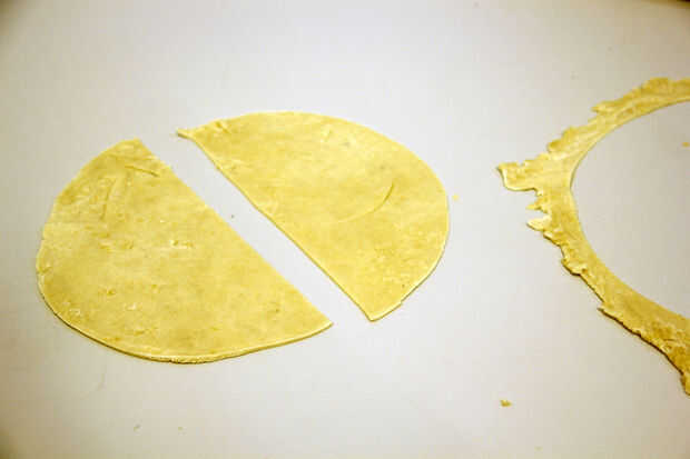 Estirar la masa, tratando de conseguir tan delgadamente como sea posible (2-3mm). Una vez enrollado, coloque una placa redonda pequeña en la masa (sólo nosotros estamos utilizando como plantilla) y cortar alrededor de la placa. Repita este paso hasta que haya utilizado toda la masa. Cortar todos los círculos por la mitad.