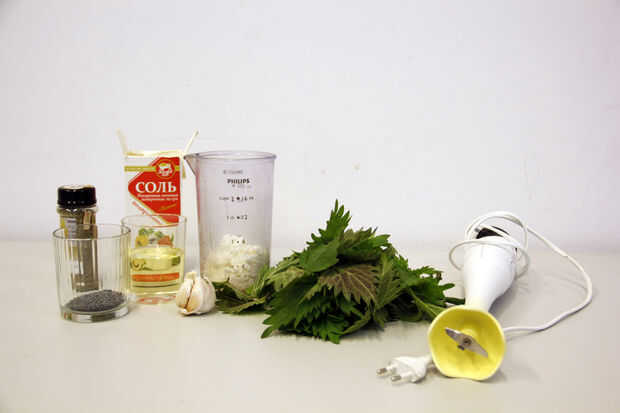 Comenzar cortando la ortiga y el ajo. Tirar todo, pero el aceite en un recipiente o su procesador de alimentos y se mezclan mientras se vierte lentamente el aceite en la mezcla. Usted debe obtener una pasta suave muy rápidamente que usted puede usar en pastas, pan o lo que tu corazón desea.