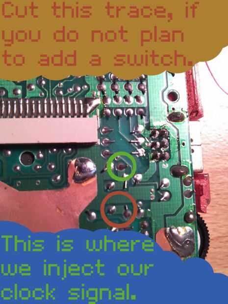 Aquí tienes a opción de añadir un interruptor! ¿quieres volver al reloj interno de gameboy? ¡No hay problema! simplemente coloque un interruptor entre el reloj de la señal! Si no vas a ad un interruptor, podría ser una buena idea cortar el rastro que conecta el oscilador interno, que también está en la foto. Si está añadiendo un interruptor - no corte esto!