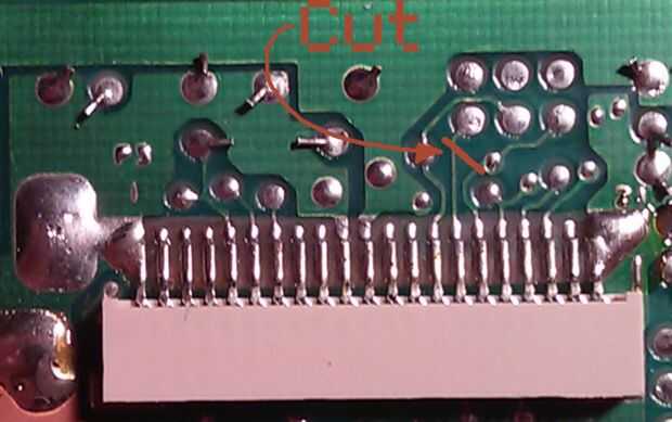Vamos a empezar por el control que vamos a estar operando en este mod. Una vez que hayas encontrado el post justo encima de la toma de cable de cinta de pantalla, cortar los dos rastros que se muestra en la imagen! Asegúrese de cortar por debajo de la vía y para asegurarse de que usted accidentalmente no corta nada. Una vez que esos contactos son historia, vamos a empezar a soldar los cables al chip!