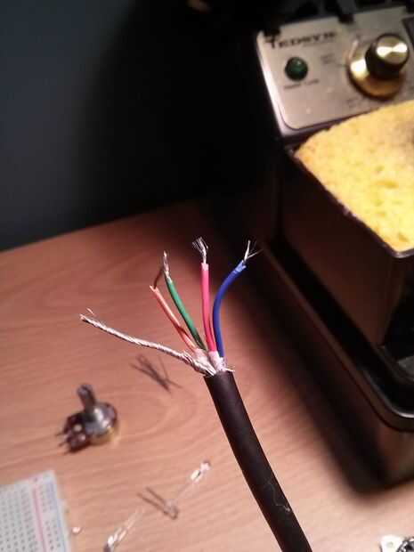 Ahora echa un vistazo en el Cable de enlace, cáscara lejos de la carcasa de alambre negro para echarle un vistazo a los cables dentro de! Que tendrá cinco - una azul, una roja, una verde, una naranja y un amarillo (esto no es contar la sucia tierra/protección que no tenga ningún aislamiento). ¿Si tienes suerte como yo y sólo tiene las cuatro - importo vamos a necesita una fuente de energía diferente para tu teclado - tal vez algunas baterías?