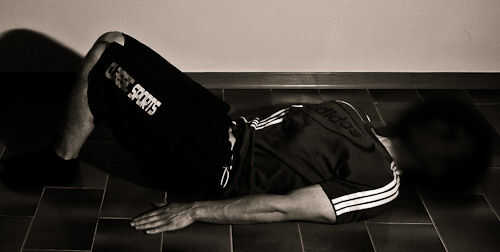 Ponen de espaldas en el suelo, llevar las piernas en un ángulo de 90 grados en las rodillas, manteniendo los pies en el suelo. Enderezar la espalda con la pierna superior levantando la espalda del suelo, mantener la posición durante unos segundos y volver a la posición inicial.