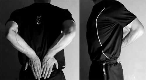 Pie derecho poner las palmas de la mano en su espalda y empuje hacia adelante el hombro detrás de usted y de su pecho.
