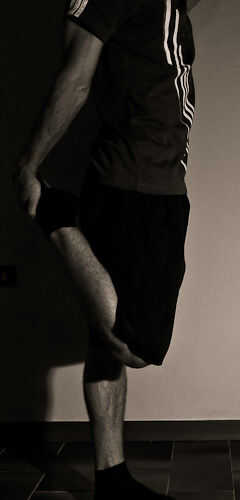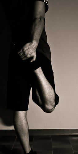 De pie o acostado a su lado, con su mano derecha Coja su tobillo derecho y tire de ella hacia la espalda, mantener las piernas en línea recta con su cuerpo.