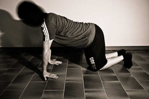 Permanecer en el suelo en una posición de paseo de bebé, de la mano directamente a distancia de los hombros y las rodillas en el suelo, hacia las piernas a 90 grados. Ahora pon las manos para que la palma está tocando el suelo y su alcance está apuntando directamente a sus piernas, luego estiramiento inclinándose a su torso, tenga cuidado de no poner demasiado estrés en la muñeca.