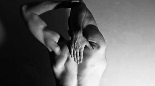 Ponga la palma de la mano derecha en su columna vertebral llegando a como puede, tome su codo derecho en su mano izquierda y empuje en un tramo. Repita los brazos conmutación.