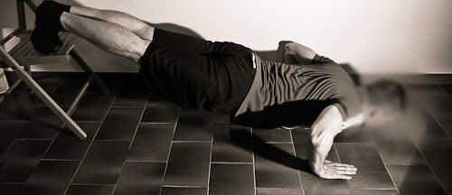 Poner los pies sobre una superficie sólida de la subida, como un cuadro o una silla sólida y realizar una presión regular, hasta unas pocas pulgadas de la tierra, pecho no bang su cabeza/barbilla.