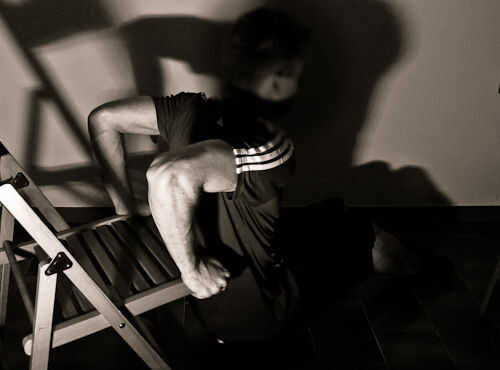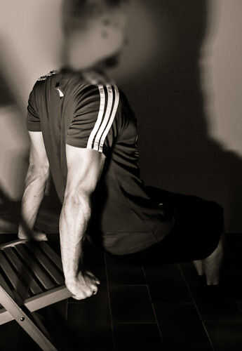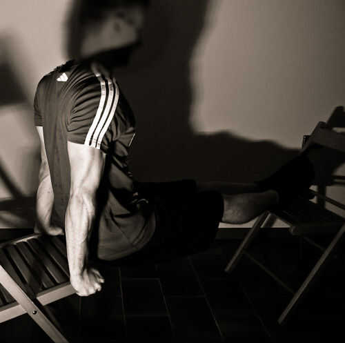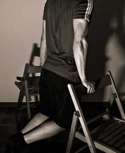 Poner las manos como en la posición básica dip pero ponga los pies en una superficie sólida y levantada, como una silla robusta, si es la superficie de los pies a la misma altura que la superficie de las manos que puede mantener las piernas rectas.