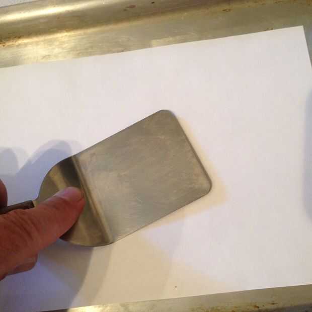 • Coloque la bandeja en un área que puede soportar el calor (es decir: tabla de cortar) y retire la bolsa de papel superior con la espátula.