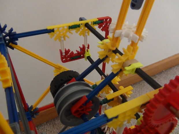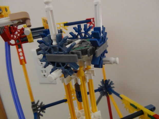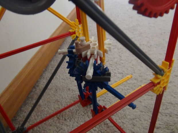 Mismo concepto como el brazo de bola encadenada en el paso anterior, pero esta es donde los engranajes pueden permitir que armas a cooperar entre sí. Este elemento fue concebido originalmente por Thibault en su máquina de la bola del Milenio en 3:22. Existe otra versión de este elemento que ahorra más altura construido por dickheijboer que puede verse aquí (paso 1).