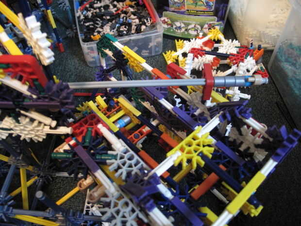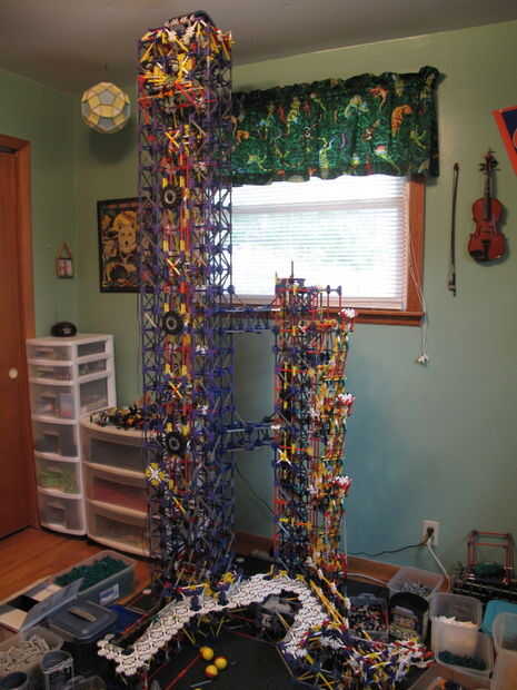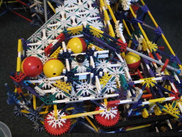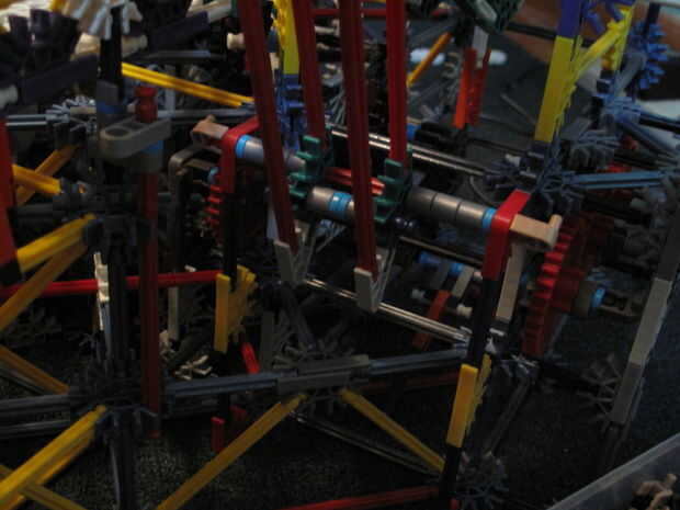 máquina de la bola sin terminar (pase a 4:47 del video para ver la elevación). Utiliza armas que son paralelas y están conectados en la parte posterior. Bolas del rodillo abajo del brazo en una garra, y cuando los brazos llegan a la parte superior, la bola pasa a través de una aleta en la parte inferior del brazo próximo. Mi versión no funcionaba muy bien, ya que hubo mucha tensión cuando estaba completamente lleno de bolas. También fue bastante lento.