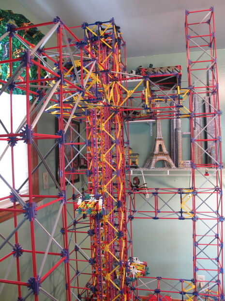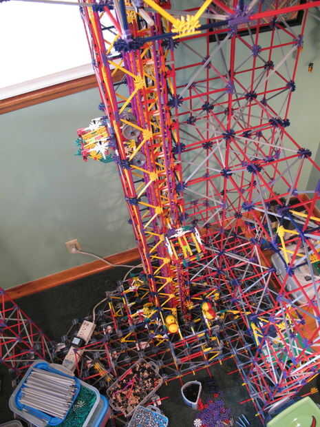 Se trata de un ascensor que fue construido en la ciudadela. Utiliza dos carros para levantar las bolas, cada una con 4 bolas. Puesto que los carros pesan lo mismo que actúan como contrapeso del otro. Utiliza una simple transmisión de avance/retroceso para cambiar de dirección (la caja de cambios se encuentra en la base). El video a continuación muestra todas las piezas de trabajo. Hay dos carretes de linea de pesca, y los carretes son fáciles de ajustar, que ayuda a combatir el estiramiento de la línea de pesca.