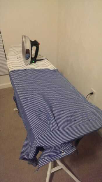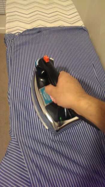 Cuando termine esta plancha la mitad de la camisa, mover la camisa para que la otra costura entre la parte delantera y trasera de la camiseta se encuentra contra el borde de la tabla de planchar, para que la otra mitad de la espalda está mintiendo en la cara de la tabla de planchar. Tomar la plancha y otra vez moverlo hacia adelante y hacia atrás, allanar arrugas todos en el proceso.