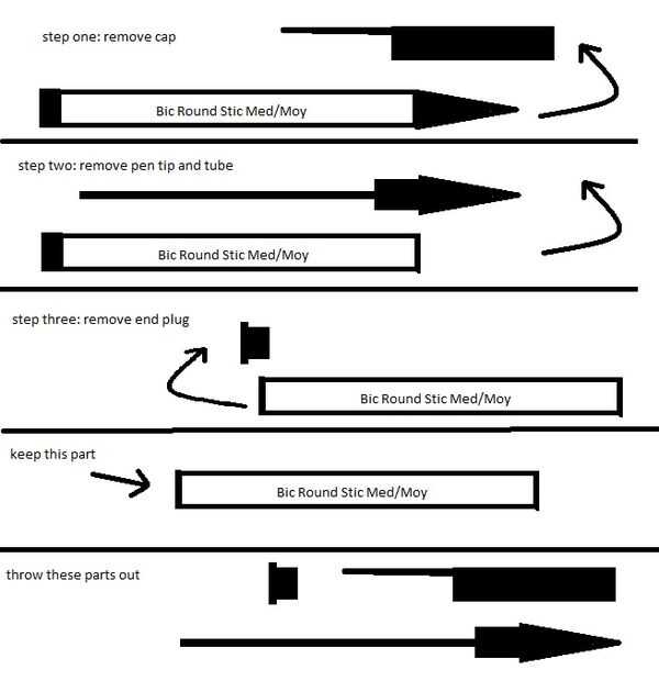 Plumas: existen diferentes tipos de plumas, y no puedo posible sabe cómo preparar cada tipo diferente. Aquí voy a mostrar cómo desarmar un Bic Round Stic. (realmente no necesito mostrarle cómo hacer esto, es muy simple, pero lo haré de todos modos, al eliminar la necesidad de preguntas estúpidas). se refieren a las imágenes.