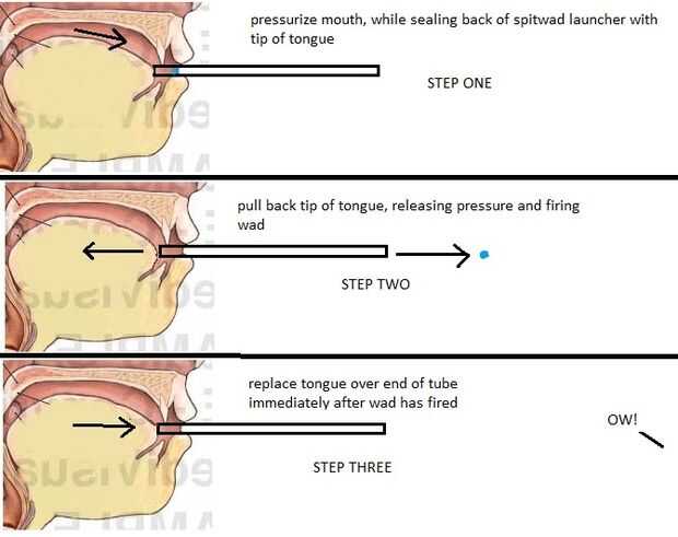 Leña: Heres otra parte donde los pequeños detalles realmente contar. Después de algunos experimentos, he descubierto la manera óptima de disparo. Parece complicado, pero es realmente muy simple y una vez que aprendas que no olvidarás. Empezar con un lanzador cargado en posición de disparo. empujar la lengua contra la parte posterior del lanzador, sellándolo. Asegúrese de que su boca está sellada. soplar aire dentro de la boca, manteniendo la lengua en la parte posterior del lanzador. rápidamente tire de la punta de su lengua la parte de atrás del lanzador, soltando el aire. una vez que ha disparado el taco, soplando de parada o detener el flujo de aire nuevo con la lengua, permiten solamente suficiente aire venir hacia fuera para lanzar el wad, alguno más crea excesivo ruido y afecta exactitud. Consulte las fotos mal dibujadas para mayor claridad.