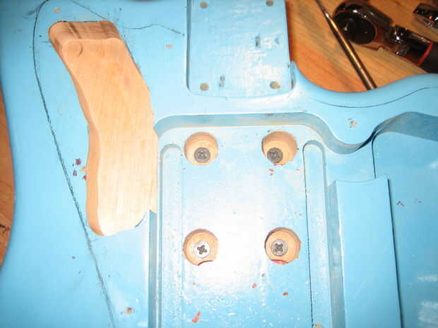 Si sólo había utilizado tornillos de madera, al menos para los carros de lado del cuerpo, no hubiera arruinado la apariencia del cuerpo, pero esta guitarra ya la gran derrota. Supongo que tengo pude llena de Bondo carrocerías filler o relleno de madera y pintado sobre él, pero como veréis, he encontrado una solución más simple.