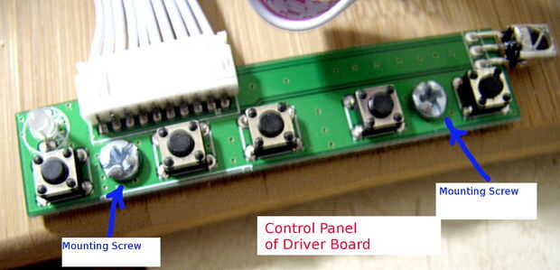Suavemente estire el cable plano, para colocar el tablero de conductor debajo de la pantalla. Se estampará la tarjeta de conductor con tornillos para madera por los agujeros de montaje a la placa base de bambú. Asimismo, el panel de control pequeño, conectado a la tarjeta de conductor con un cable de cinta acanalada, se conecta a la placa base con tornillos.