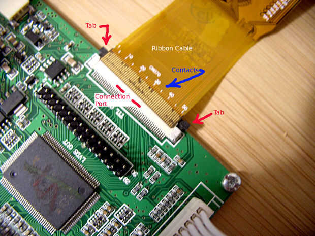 Cuando se haya secado el pegamento debajo de los imanes, podemos colocar la pantalla sobre los imanes y moverse suavemente a la posición correcta (trazada de antemano). A continuación, tenemos que conectar el cable de cinta de la pantalla al puerto correspondiente en el tablero del conductor. El puerto dispone de una ficha pequeña que necesita ser tirado abierta. Cuidado! Esto es una operación delicada. Ahora, inserte con cuidado el cable de cinta de la pantalla en el puerto, con la brillante fila de contactos hacia arriba (ver imagen). Sólo pasará en unos pocos milímetros. Finalmente, empuje la pestaña detrás hacia adentro para bloquear el cable.