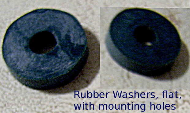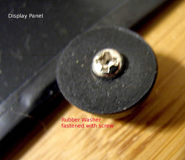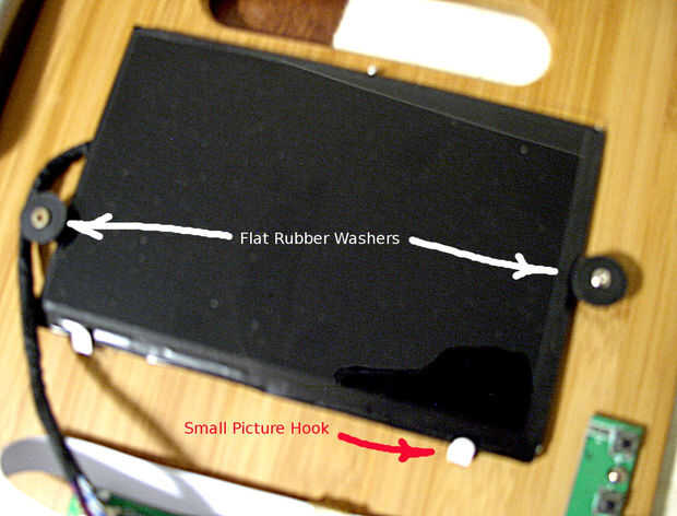 Sí, pero ¿qué pasa con los que muestra falta un metal forro? Los imanes no son útiles para la fijación de estos bebés. Afortunadamente, hay una estrategia alternativa para este tipo de pantalla. Usamos las arandelas de goma plana, del tipo que venden en el Departamento de fontanería de ferreterías para la fijación de grifos con fugas. Podemos atornillar a la placa base, en el lado de la pantalla, para que las arandelas superponen los bordes del panel. La presión suave de la goma mantiene el panel en su lugar a la izquierda y la derecha. Y, convenientemente, las arandelas tienen un agujero en su centro para los tornillos. Para sostener la parte inferior del panel, podemos utilizar anzuelos de cuadro pequeño de metal. Un par de estos evitar el panel se deslice hacia abajo. Consulte el último par de fotos, arriba.