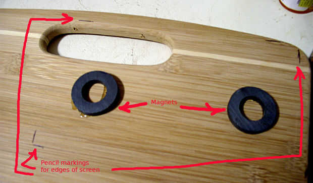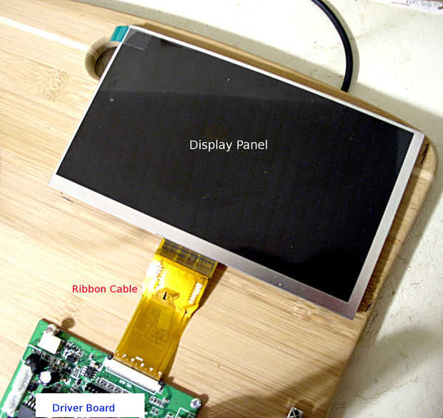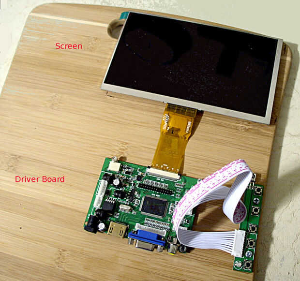 El primer módulo se montará en nuestra placa base, la tabla de cortar de bambú--es el ingenioso $30 7" HDMI pantalla comprado en eBay. La esquina superior derecha es un lugar conveniente para la pantalla y la tarjeta de conductor se monta directamente debajo, conectado por un cable de cinta. Esto le permitirá una cómoda línea de vista a la pantalla, una vez que averiguar cómo proporcionar un ángulo de visión adecuado, en un paso posterior.