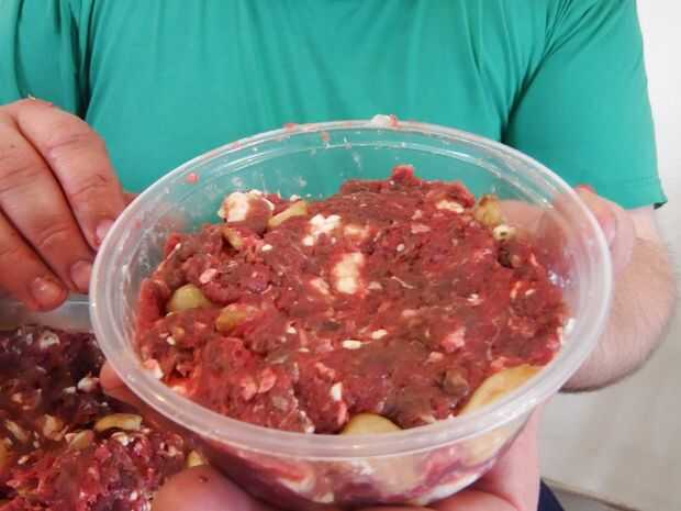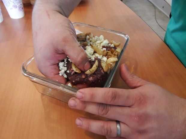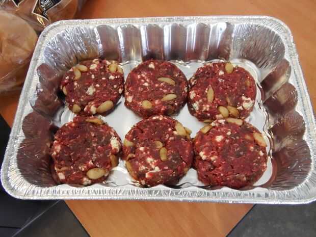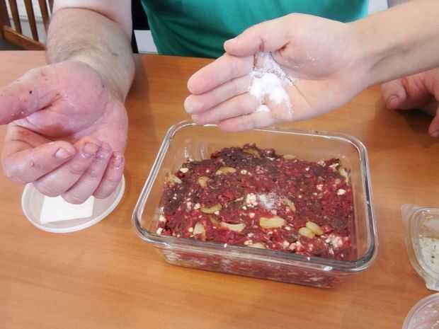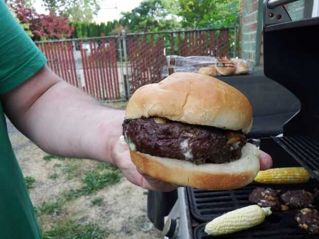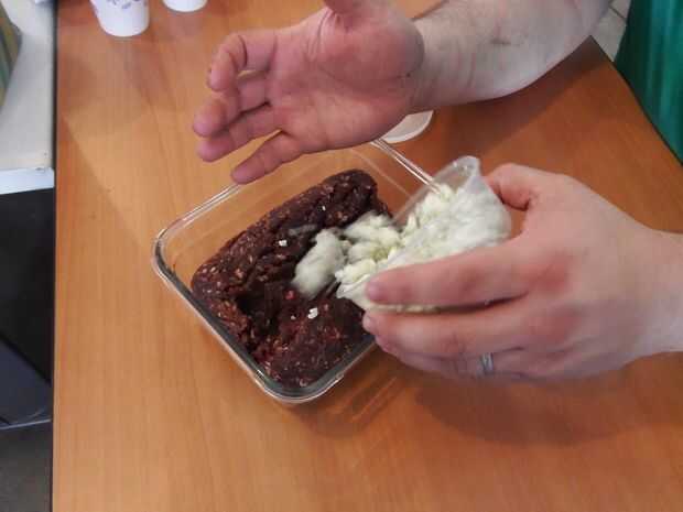 Una vez mezclado, utilizar el contenedor de queso azul para formar sus hamburguesas, con el objetivo de 1/2 libra por burger. Crea una ligera depresión en el centro de cada empanada. Esto evitará que la hamburguesa fastidiando mientras se cocinan.