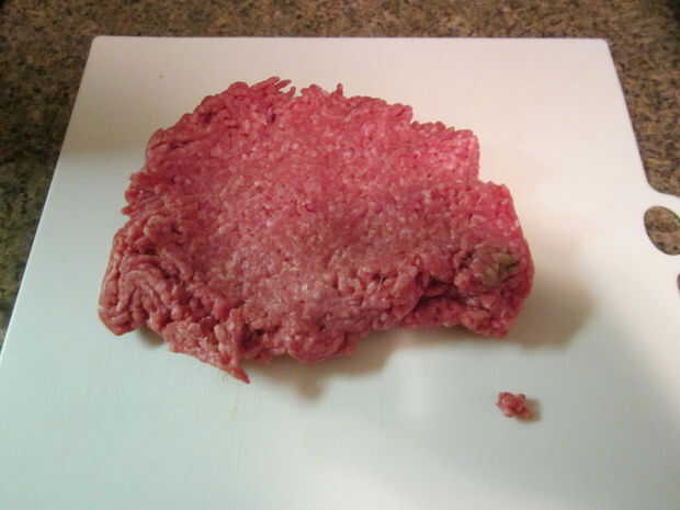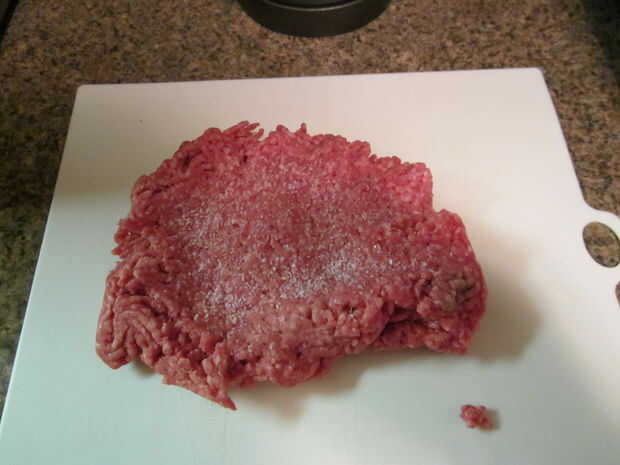 Tomar una libra de carne molida de res, pavo o cualquier carne que prefiere y pone hacia fuera y luego aplanar.  Aunque no demasiado porque hará más difícil trabajar con el camino.  Luego espolvorear con una cantidad abundante de kosher sal y articulado juntos hasta que se mezcle bien.