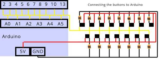 Los botones están conectados con el arduino a través de los cables, como se muestra en el diagrama anterior. Es casi lo mismo que conectar un botón, solamente un puñado de veces.