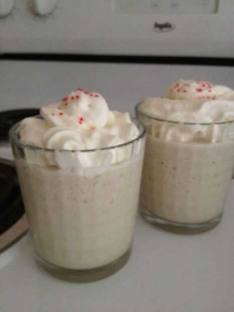 Vierta en dos vasos. Cubra con crema batida y Granillo si lo desea.
