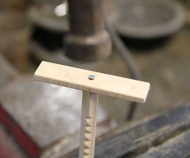 Apuesto a que la parte más difícil de este proyecto es encontrar el clavo pequeño perfecto para fijar la hélice para el palillo con muescas. A pesar de una enorme colección de clavos y tornillos en mi tienda, este pequeño bebé era difícil de alcanzar. Es aproximadamente 3/4 pulgadas largas y muy delgadas.