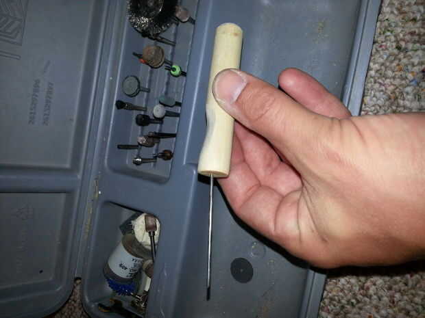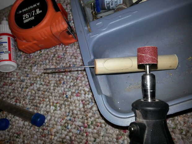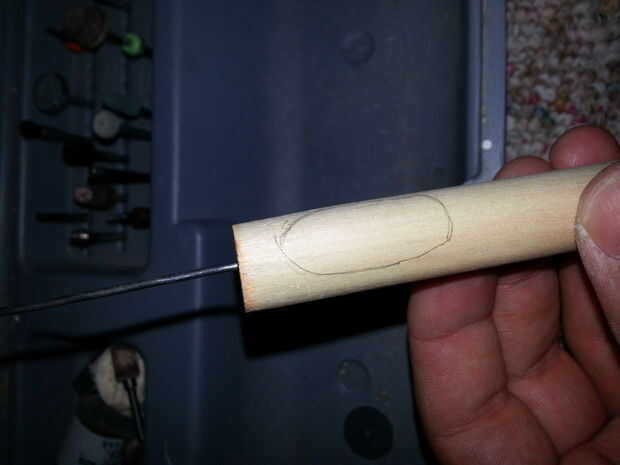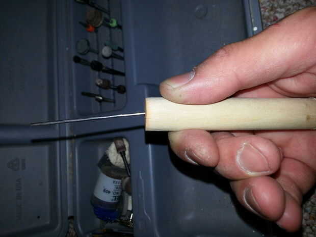 3. use la barra del accesorio para su herramienta rotatoria de lijado para afeitar una sangría en el mango de madera.