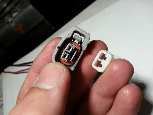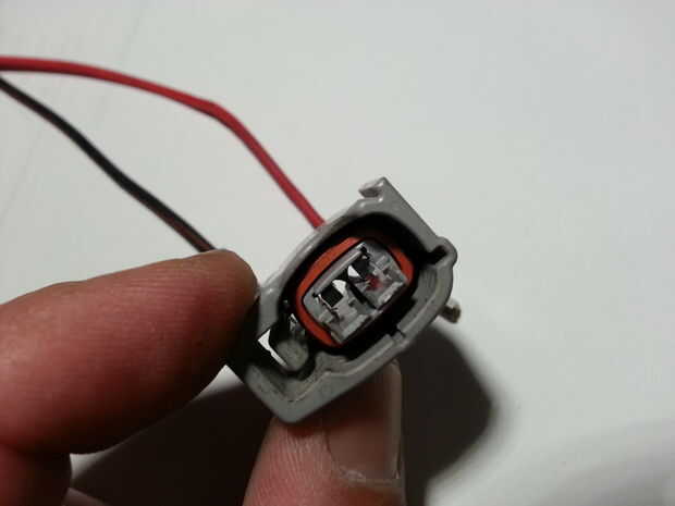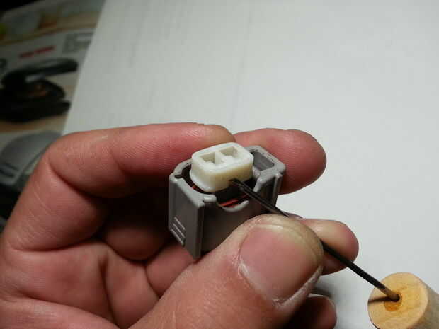 Todos los conectores que he visto tienen un dispositivo de bloqueo. En este conector de inyector de combustible de Toyota es la pieza blanca que me lo quitaron en la primera /steps de cuatro cuadros. La quinta imagen es del conector con el dispositivo de bloqueo quitado pero los terminales en su lugar, sostenido por las lengüetas de fijación.