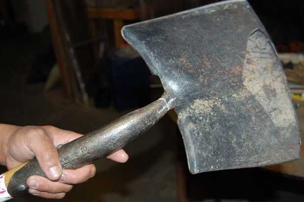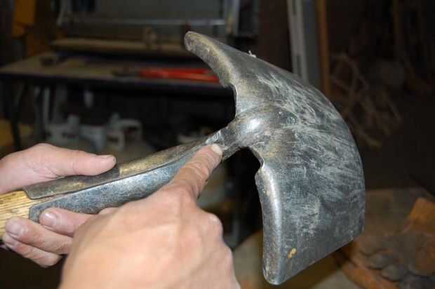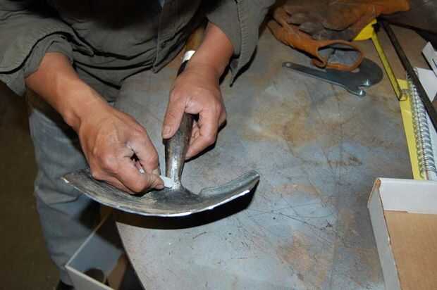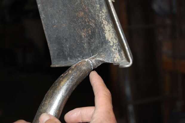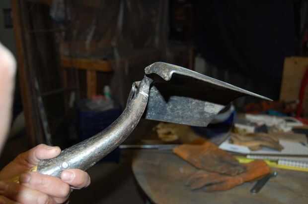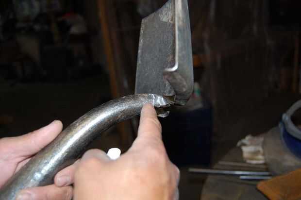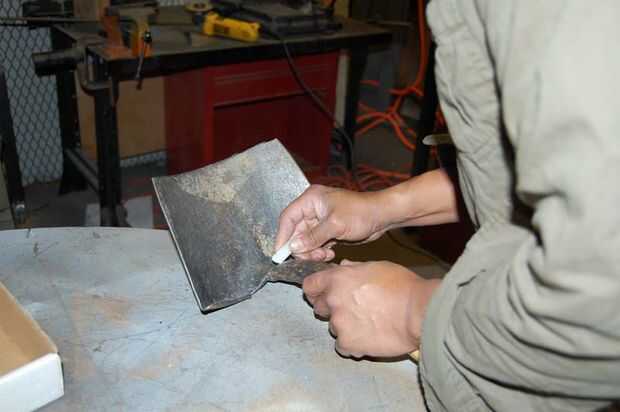 En la parte posterior de la pala se encuentra lo que yo llamo la columna vertebral. Hacer dos marcas, una marca vertical a lo largo de la longitud de la columna vertebral y una marca horizontal justo antes donde el acero se dobla encima. Asegúrese de dejar suficiente carne para soldar en. Hacer las misma marcas de esteatita en el frente y la parte posterior de la pala.