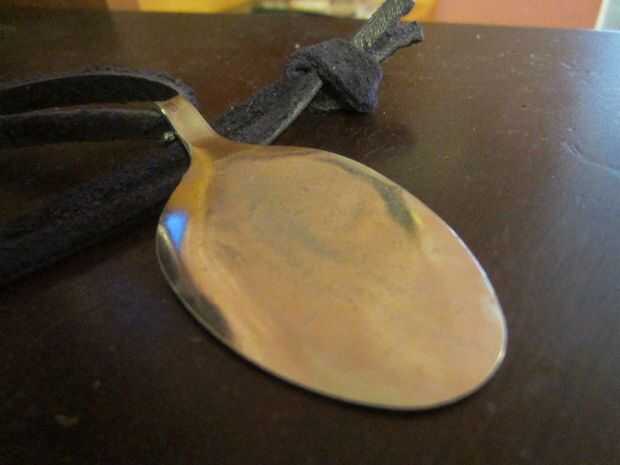 Usando una lima de metal, moler abajo de un borde de la cuchara plana hasta que esté razonablemente sostenido. Este paso es opcional y no se debe hacer si la herramienta estará al alcance de los niños pequeños. También, si se hace este paso, asegúrese de recordar en todo momento que tienes un cuchillo agudo, peligroso colgar alrededor de su cuello y actuar en consecuencia.
