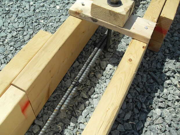 Luego vino los pernos de anclaje y barras de refuerzo. Agujeros en cada pieza de flejes perforados y me inserta el perno de anclaje, asegurado temporalmente por la arandela y la tuerca. Luego vino la varilla. Compré la varilla en 8 pies de largo por lo que salió que sólo tenía que hacer un corte para conseguir que encajarán bien. Corte que algo tediosamente hice con una amoladora. Tomé ventaja de la forma del gancho del perno de anclaje para la varilla del suelo un poco, por lo que se suspende dentro del concreto en lugar de por debajo de ella. Todo fue atado para arriba agradable y firmemente con el alambre del lazo antes de llamar a eso un día.