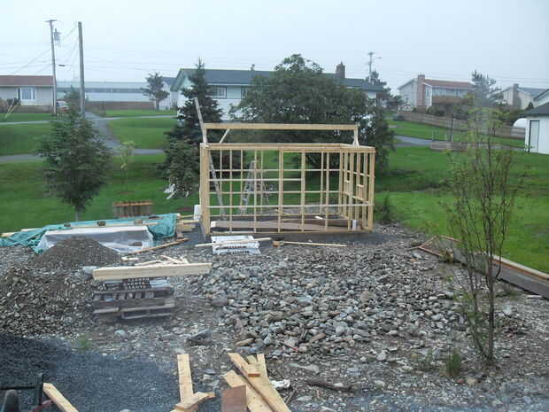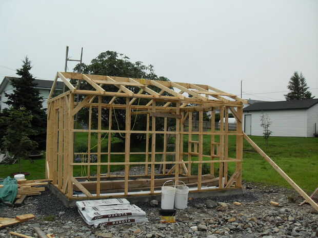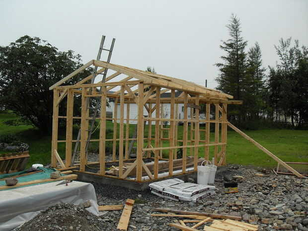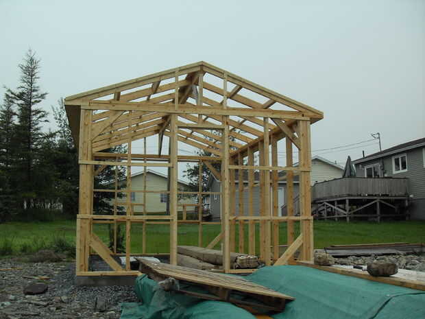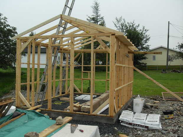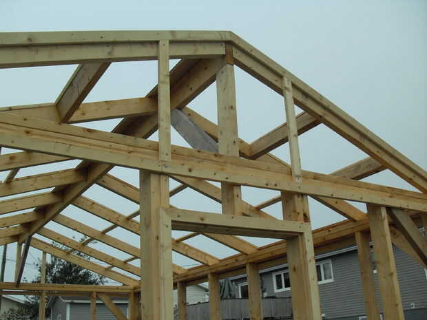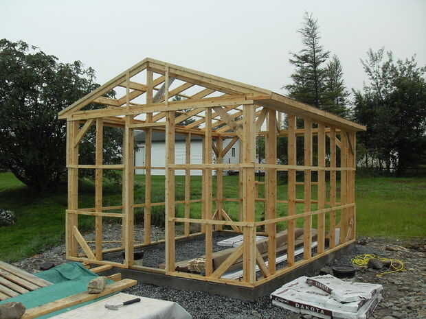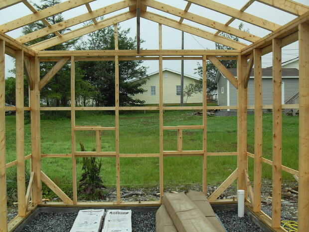 Para hacer el cuento largo, el primer paso fue levantar el poste del ridge que es un pedazo largo de 14 pies de 2 por 6. Entonces, cada viga 2 por 4 es poner en marcha en los centros de 24 pulgadas y asegurado a la cresta del poste y placa superior de la pared en la parte inferior. Fue asegurada una tira de madera contrachapada de 1/2 pulgada a lo largo de cada lado de la cresta y otra tira de la madera contrachapada a lo largo del borde inferior de cada lado del techo. Este contrachapado sirve como un punto de fijación para los cristales y para mantener el cuadrado de la azotea.