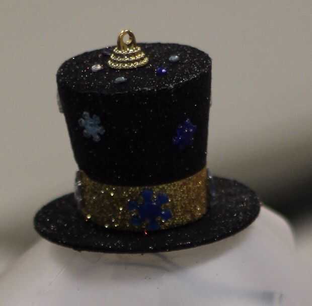 Una vez que las luces, es hora de su sombrero. Este sombrero fue un simple sombrero negro ornamento de la Navidad que yo había decorado anteriormente. Me gusta cómo se veía y también da a Junkie bling un poco. El sombrero fue decorado con pegamento caliente. E-6000 era un poco fuerte para la base de espuma de poliestireno utilizada para el sombrero, también utiliza pegamento caliente para pegar el sombrero a la jarra de la leche.
